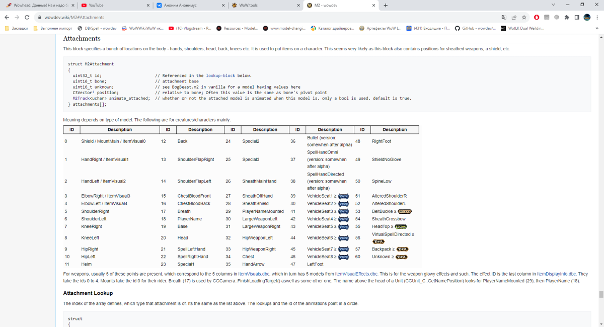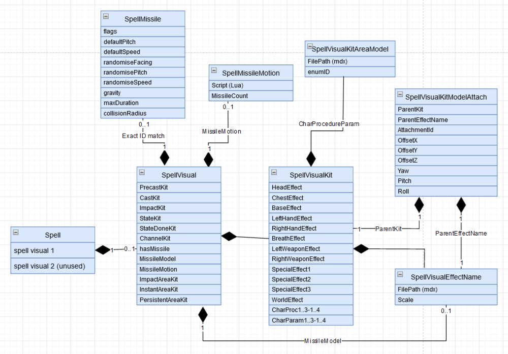 Часть 1: Таблица spell.dbc 132 колонка, далее идём с этой цифрой в spellvisual.dbc, там видим: 2 колонка - Прекаст, то есть каст заклинания. 3 - Выброс заклинания. 4 - Коротко, временный эффект, импакт(удара, влияния). 5 - Долговременный, на время действия дебафа висит. 7 - Поддерживаемое, по типу как Blizzard у мага. 9 - Модель снаряда. 12 - Звук снаряда. 16 - Другой вид импакта. 24 - Кратковременный эффект Area(области, зоны). 25 - Долговременный эффект Area. Затем идём в SpellVisualKit.dbc,там привязка к нужным Attachments(Привязки, части), видим следующее: 3 колонка - Анимация 4 - Голова 5 - Тело 6 - В ногах 15 - Мировой эффект 16 - Звук Далее идём в SpellVisualEffectName.dbc, видим: 2 - Имя 3 - Модель 5 - Scale(Размер) 6 - Минимальный Scale 7 - Максимальный Scale SpellVisualKitModelAttach.dbc эта таблица, если надо прикрепить эффект к какому то не стандартному Attachment по типу локтя или бедра, а так же если нужно прикрепить к 1 Attach несколько эффектов. В ней же можно по координатам X Y Z двигать всё. Связь с ней такая: в SpellVisualKit.dbc создаётся строчка, там может быть Анимация + Звук, может быть так же и Эффект. Часть 2: Потом идём в SpellVisualKitModelAttach.dbc, там: 2 колонка - Cсылка на SpellVisualKit 3 - Норма модели в SpellVisualEffectName 4 - Attach модели,(на скрине норма и что куда) 5,6,7 - Это X Y Z 8,9,10 - до сих пор не совсем понятно что это и для чего... SpellIcon - Иконки, колонка 134 в spell.dbc В какой-то колонке Achievement тоже на норме с этой таблицы ссылка-путь ставится. SpellChainEffects - Это создание самого потока эффекта(пока лучше не трогать), по типу Цепной Молнии Шамана, саму молнию делать в ней. SpellVisualEffectName - Список моделей там же Scale (мин и макс размеры модели Spells), но туда можно и другие модели прописать. ligthingband - не до конца известно, что это такое. Для простоты, суммируя последовательность редактирования и взаимосвязей: spell.dbc -> SpellVisual.dbc -> SpellVisualKit.dbc -> SpellVisualEffectName.dbc Это базис, но в разных случаях, могут добавляться ещё и другие таблицы.- Конвертация моделей выше легиона с _lod в Wotlk