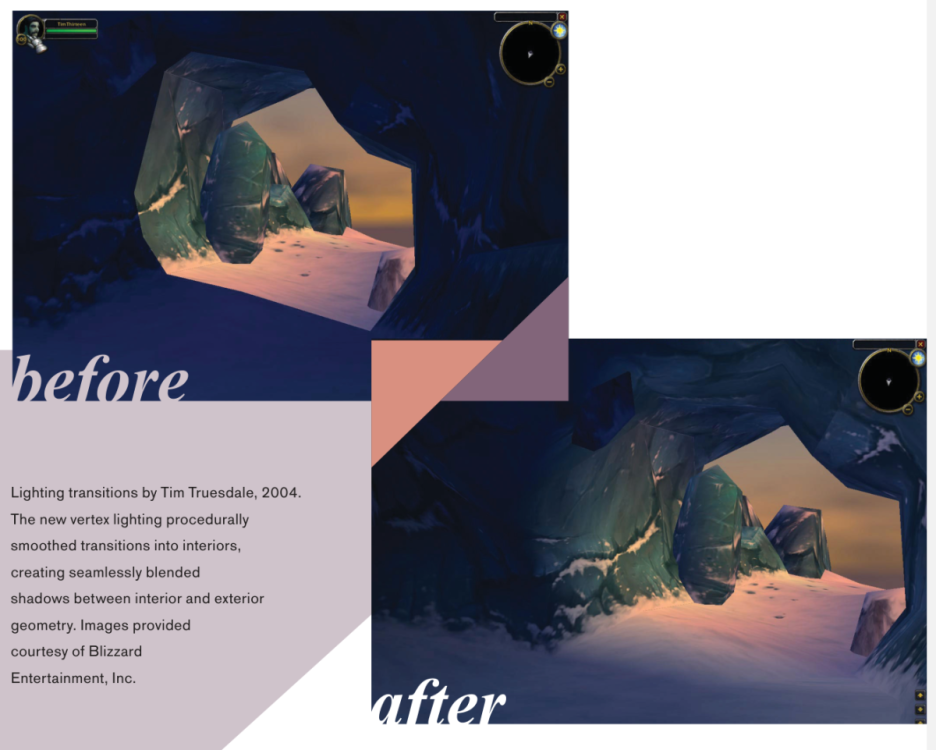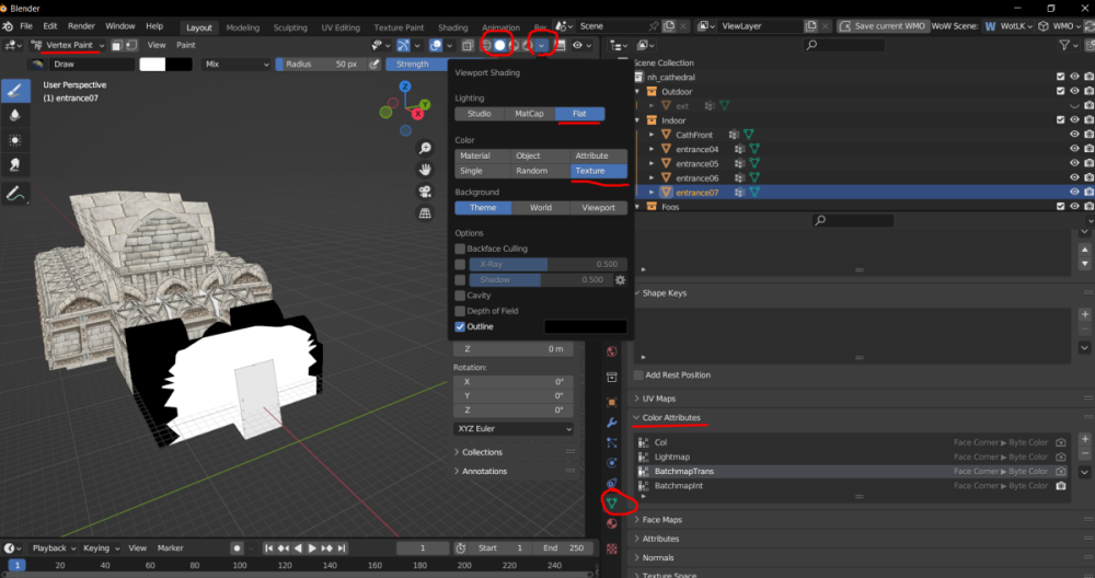 Освещение в входах WMO объектах, моделях обычно плавно переходит между внутренним и внешним освещением. Эти группы цветов вершин (BatchmapTrans и BatchmapInt) позволяют вам контролировать, как выглядит этот переход. Используйте группы цветов BatchmapTrans и BatchmapInt, чтобы создать световое пятно, которое использует естественный свет под "отверстием в потолке". Таким образом, если снаружи была ночь, там будет темно, а если день, то будет светло. Они могут вести себя немного по-разному в зависимости от определенных флагов, таких как "Use Unified Rendering"(Использовать единое отображение). Это также влияет на то, имеет ли освещение, идущее от объектов (например, факелов), какое-либо воздействие на WMO или нет.