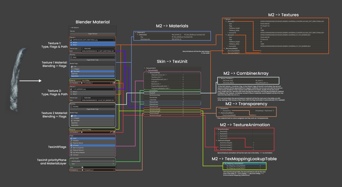 Гайд(*WowBlenderStudios*): Диаграмма, объясняющая связи вашего материала M2 в Blender и его внешний вид в вашем файле mM2 и Skin, плюс некоторые пояснения.