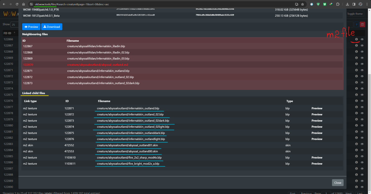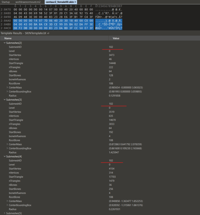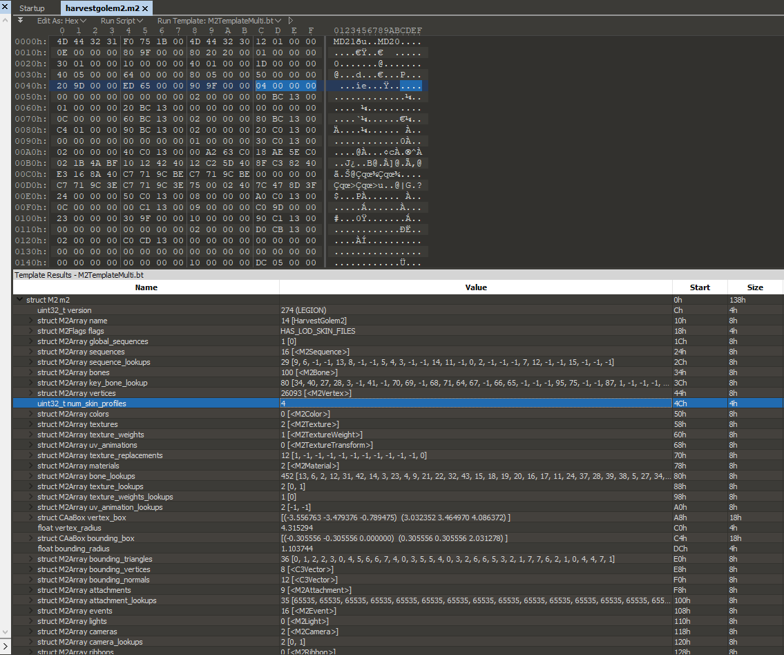 1. Скачиваем модель+ все доп. файлы к ней привязанные (посмотреть можно на сайте(скрин) или WowExport утилита) 2. Проверяем сколько в m2 используется .skin's, через плагин M2TemplateMulti.bt(открывает неконвертированные модели) в 010Editor. Cтрочка будет называется - uint32_t num_skin_profiles. 3. Начиная с WoW v10.1 изменилась система, практически у всех новых моделей 1 .skin файл, в т.ч. у сложных. Поэтому необходимо ставить 4 как на скрине. Сохраняем изменения Ctrl+S. (если модель версии ниже и там меньше скинов(напр.2), то ставим 2) 4. Со .skin файлами нужно сделать следующую манипуляцию: 00 skin не трогать, lod01 переименовываешь в 01 .skin lod02 переименовываешь в 02 .skin lod03 переименовываешь в 03 .skin Далее прогоняешь модель через M2ModRedux_9.0.0, в m2i. Пересоздаются skin файлы и m2 с 4 skin's или сколько нужно (Колич.может уменьшиться). 5. На этапе конвертации через M2Mod будет м2i файл, если потребуется Импортируем в Blender(с плагином WowTools) и редактируем(если необходимо), далее конвертируем m2i в m2. (сложные модели необходимо, так как лимит полигонов у Wotlk не большой = 21845, модификатор Decimate к модели в Blender) 6. Как получили свежий m2, перемещаем файл m2 и skin's FixTXID(в папке должен быть свежий listfile(Ссылка ниже)), он пропишет в модель согласно listfile текстуры и удалит блок TXID. 7. Далее переносим файлы .m2, .anim и .skin в MultiConverter_3.3.0 и нажимаем FIX. PS. Иногда нужно внутри m2 через 010Editor менять адреса текстур, их имена, что были Hardcode пути или читались из папки. https://github.com/wowdev/wow-listfile- Azertothcore Repack (Monk class Retroported + PvE Spectator) - 3.3.5a