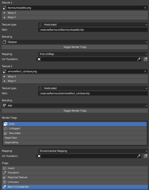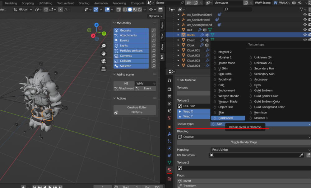 Hardcoded - это метод жёсткой ссылки(привязки) на текстуру по ее пути, используемый для моделей, которым не требуются какие-либо вариации текстур. Skin используется для моделей персонажей, они загружают текстуру кожи, на которую ссылается CharSections.dbc, имеют текстурные приложения брони, если есть какой-либо предмет, надетый на персонажа, и не имеют прозрачности. Skin Extra также используется для моделей персонажей, но не имеет текстурных приложений брони и может иметь прозрачность. DBC Monster1...3 - это текстура(одна или несколько), используемая для существ, у которых настроены текстуры в CreatureDisplayInfo.dbc. DBC Monster 1 находится в столбце 7, DBC Monster 2 - в столбце 8, а DBC Monster 3 - в столбце 9.