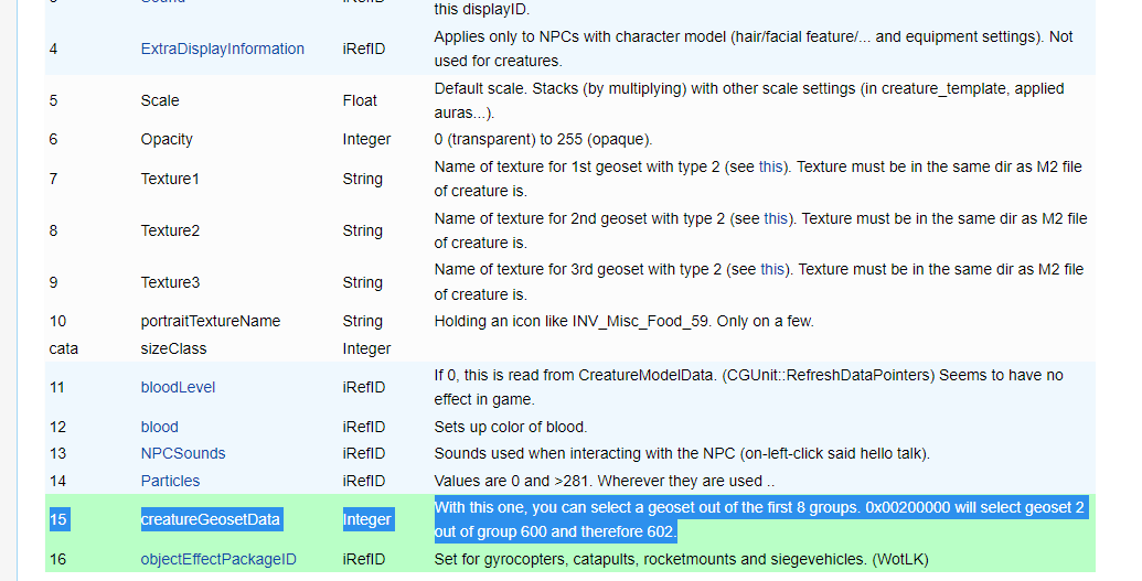1. Портируем, конвертируем модель на Wotlk (Гайд есть в канале) 2. Настройка(или нет) Geoset(напр.брони) в блендере через файл m2i. 3. Добавляем её в MPQ игровых архивов папки /Data. 4. Открываем ModelViewer, там где можно посмотреть модельки, левая верхняя панель View -> ShowModelControl, появляется окно с Show GeoSets, там они идут по порядку. Первая цифра в записи - группа Geoset, вторая - ID в группе. Всего Geosets у NPC может быть 8 (Не включая 0 группу, то есть от 1 до 8!). Далее нужно получить идентификатор общего Geosets, который записывается в 15 колонку CreatureGeosetData таблицы = CreatureDisplayInfo.dbc *(используйте для редактирования утилиту/программу WDBX) Делается это так: 5.1 Записываем 16-ричную форму: 0x00000000, после 0x идет 8 нулей, каждый из которых отвечает за 1 из 8 групп Geosets. Группы идут по убыванию слева-направо 8-1. 5.2 Для того чтобы использовать определенный Geoset для конкретной группы Мешей(Mesh), необходимо нужный тебе 0 заменить на id Геосетов в группе. Например, хочешь ты добавить 2 Геосет из 3 группы, и 4 Геосет из 5 группы, тогда получаем: 0x00040200. 5.3 Переводим получившееся число в 10-чное представление 0x00040200 = 262656. (используя калькулятор) Записываем в таблицу CreatureDisplayInfo.dbc. 5.4 И так же, вы не сможете задействовать одновременно несколько Геосетов из одной и той же группы. 1 группа = 1 активный Геосет. Дополнительная информация по Geosets: Geoset так же можно комбинировать и тщательно настраивать их отображение, привязывать к той или иной группе, через файл .skin модели, через соответсвующий Темплейт в программе 010 Editor. Дополнительное описание, ссылка: https://wowdev.wiki/DB/CreatureDisplayInfo - Простая инфографика по взаимосвязям в *Spells